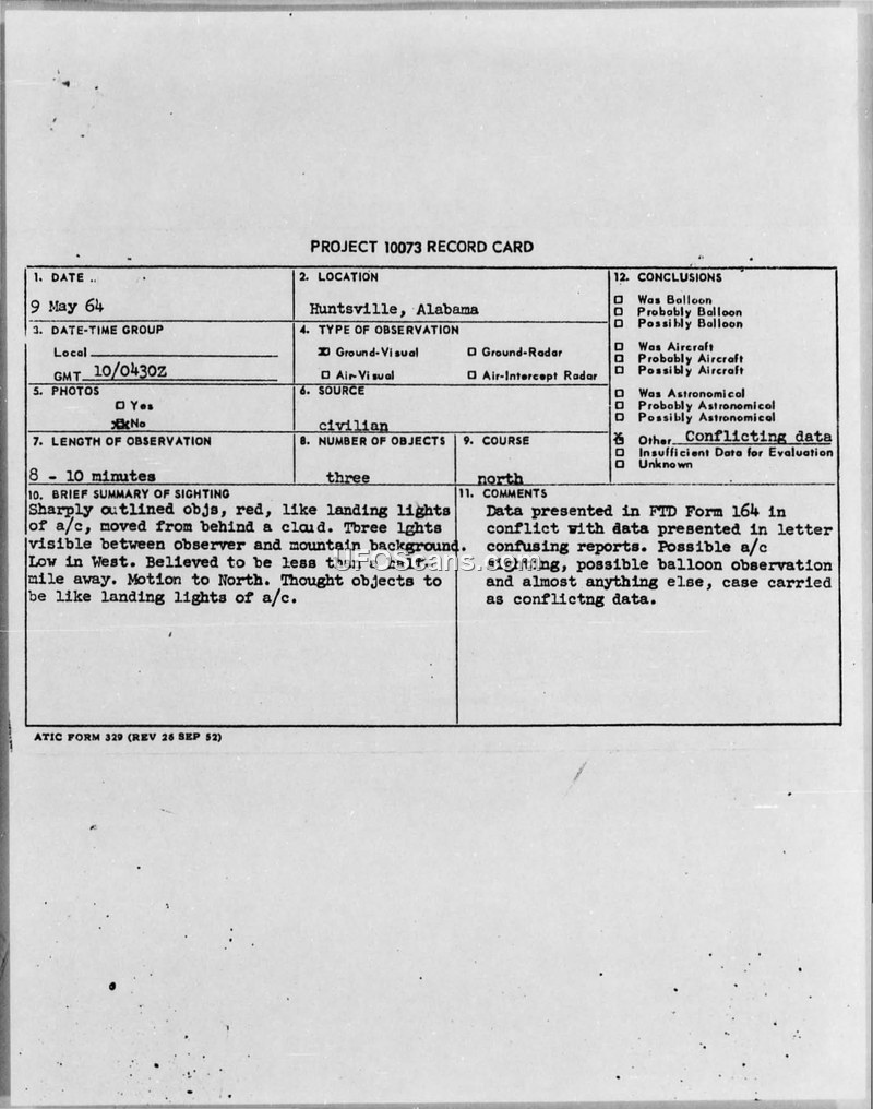Project 10073 Record Card — Huntsville, Alabama, 9 May 1964
