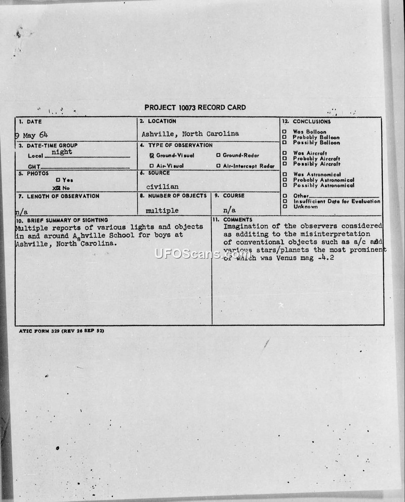 This document is a collection of reports and correspondence regarding multiple sightings of unidentified aerial phenomena by students at the Asheville School for Boys in North Carolina during May 1964. The primary incident occurred on May 9, 1964, at approximately 5:10 A.M., where students reported a disk-shaped object at an altitude of 12,000 feet. The object was described as having a golden disk, soft blue lights, and a silver-like top, exhibiting a clockwise rotation of approximately 40 R.P.M. and emitting a high-pitched sound. The students provided detailed sketches and descriptions of the object's maneuvers, including a claim that it hovered over a water tower before departing at high speed. The students also reported other sightings throughout early May, including glowing white objects and orange hovering objects. The reports were compiled by students and sent to the U.F.O. Filtration Center at the Pentagon. The students expressed concern that their reports might be dismissed as a joke or 'spring fever' and insisted on their honesty. The U.S. Air Force, through the Foreign Technology Division at Wright-Patterson Air Force Base, evaluated the reports. In a letter dated June 3, 1964, Major Maston M. Jacks informed the correspondent that there was no data to indicate the observations were anything other than stars, planets, or conventional aircraft, specifically noting that Venus, with a magnitude of -4.2, was the most prominent celestial body during that period. The official Project 10073 record card similarly concludes that the sightings were likely misinterpretations of conventional objects, stars, or planets, exacerbated by the observers' imaginations.