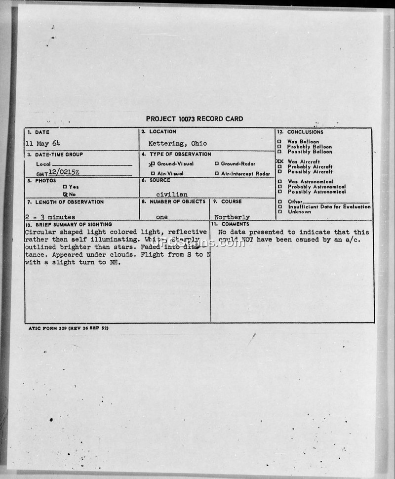 Project 10073 Record Card — Kettering, Ohio, 11 May 1964