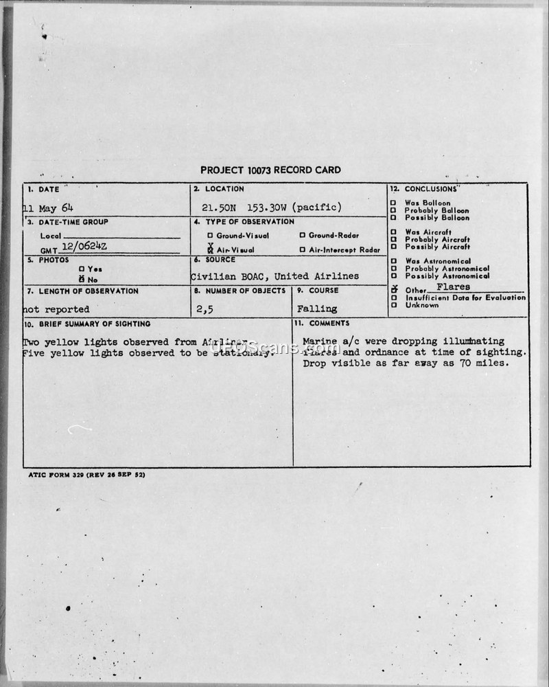 On May 11, 1964, two separate reports were filed regarding the observation of yellow lights in the Pacific region near Hawaii. The first report, involving United Airlines flight 197, noted two yellow lights observed over the Shark Intersection at 39,000 feet. The second report, involving BOAC flight 911, observed five yellow lights at approximately 0 degrees from the horizon. Both reports were processed through the Air Force Staff Message Branch and documented on Project 10073 record cards. Military investigation determined that the sightings were not unidentified aerial phenomena, but rather the result of Marine aircraft conducting exercises involving the dropping of illuminating flares and ordnance. The reports explicitly state that these flares were visible from as far away as 70 miles, providing a terrestrial explanation for the lights observed by the civilian airliners.