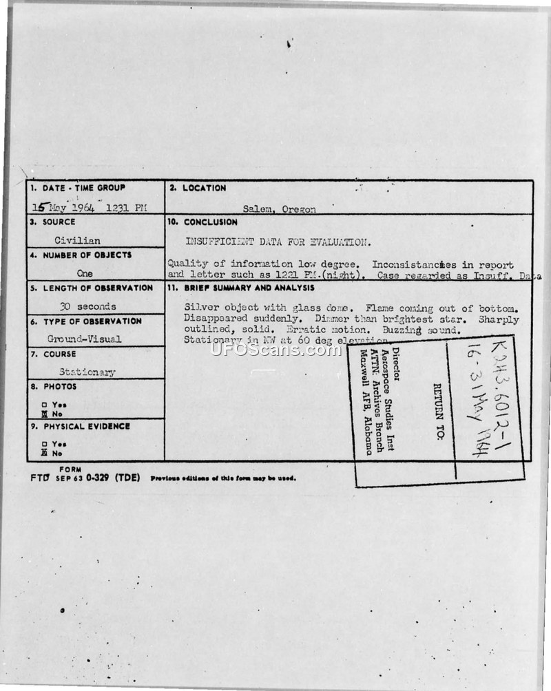 An 11-year-old witness reported a silver, dome-shaped object with a buzzing sound and a flame in Salem, Oregon, in 1964. The Air Force concluded the report provided insufficient data for a formal evaluation.