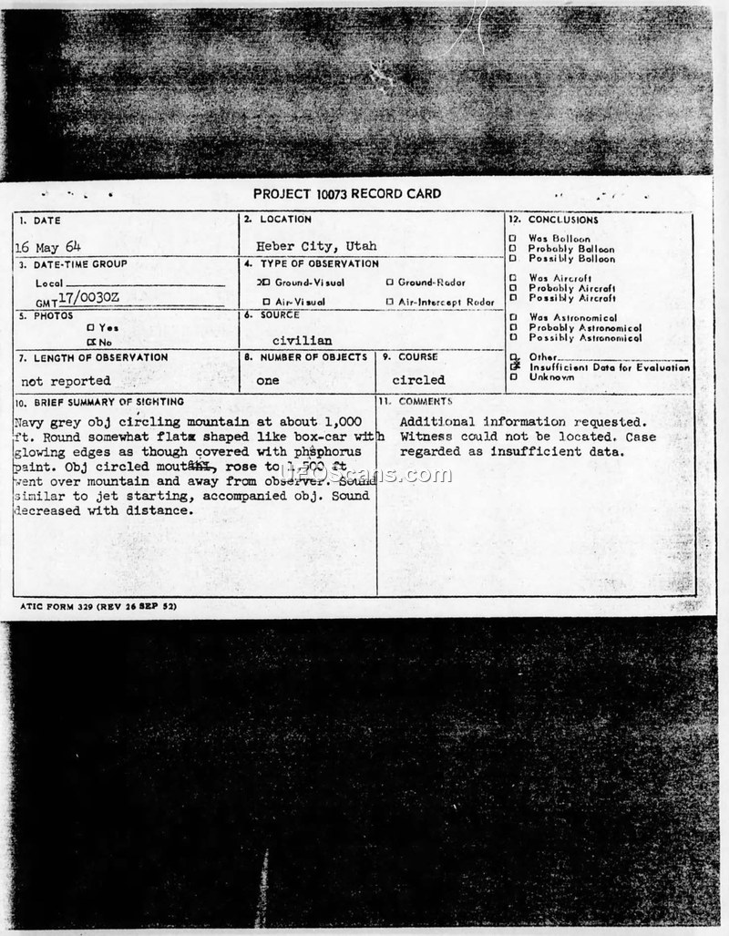 A 19-year-old truck driver reported a glowing, boxcar-sized object near Heber City, Utah, on May 17, 1964. The Air Force was unable to locate the witness for follow-up, leading to the case being closed as insufficient data.