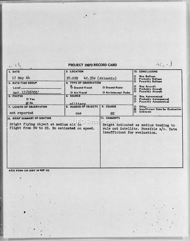 On May 17, 1964, at 0630Z, a bright flying object was observed by personnel aboard the SS PRESIDENT JACKSON at coordinates 38.02N 42.38W in the Atlantic. The object was reported to be flying from the Northwest to the Southeast at a medium altitude. No speed estimate was provided by the witnesses. The weather conditions at the time were described as partly cloudy with a moderate Northwest sea, a temperature of 59 degrees Fahrenheit, and a barometric pressure of 39.18 inches. The sighting was reported via a military message channel and subsequently processed under Project 10073. The official evaluation concluded that there was insufficient data to identify the object, though it was noted that the medium altitude tended to rule out a satellite, and that it was possibly an aircraft.