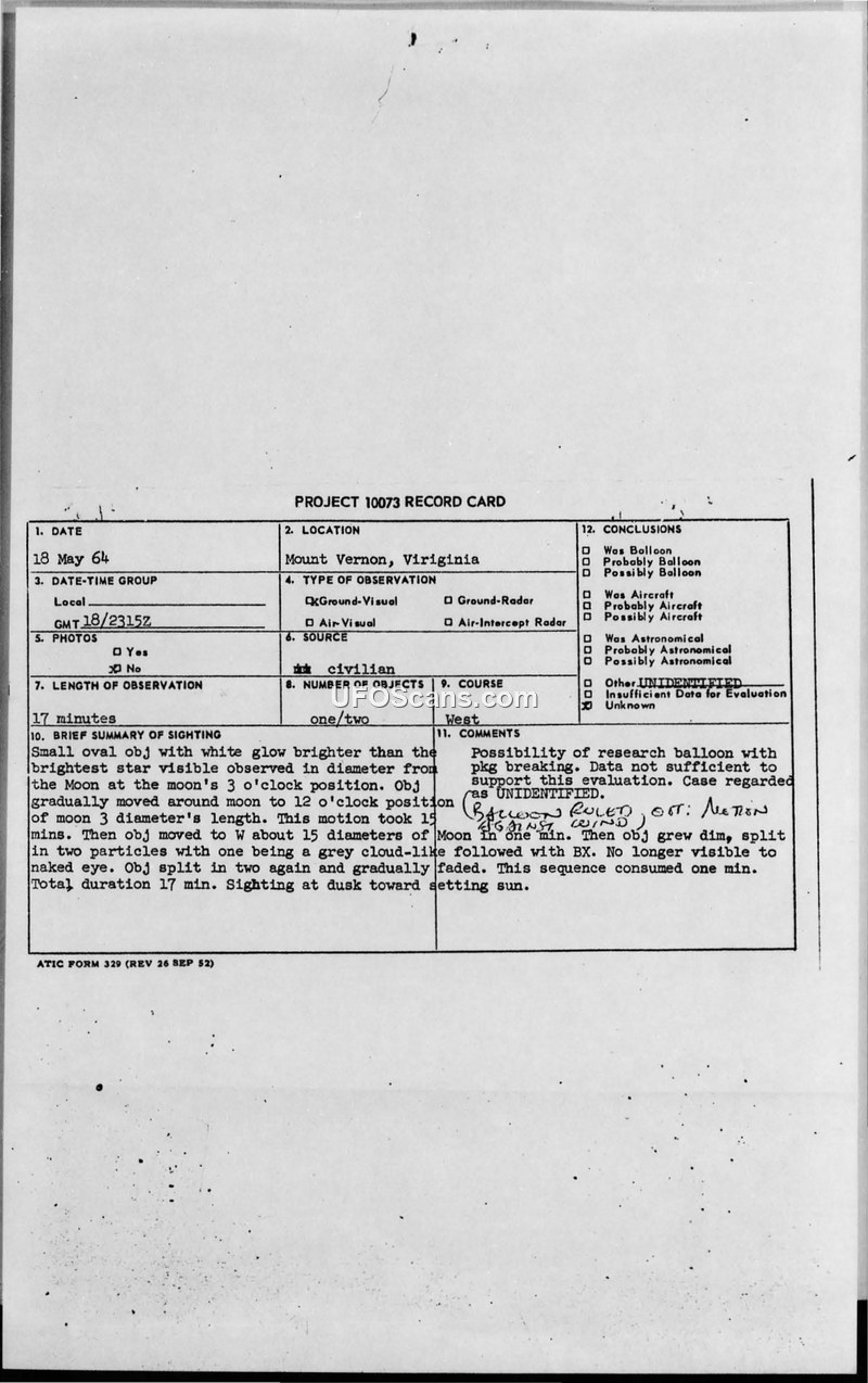 On May 18, 1964, at approximately 2315Z, a civil engineer affiliated with GIMRADA at Fort Belvoir, Virginia, reported a sighting of an unidentified aerial phenomenon near Mount Vernon. The witness, described as reliable, observed a small, oval-shaped object with a white glow brighter than the brightest star. The object was initially positioned near the moon and moved around it over the course of 15 minutes before accelerating westward. During this movement, the object dimmed, split into two particles, and formed a yellowish-gray cloud. The witness continued to observe the object with binoculars until it split again and eventually faded from sight. The total duration of the sighting was 17 minutes. Official military correspondence from the 1001st Air Base Wing at Andrews AFB noted that while the sighting might have been a missile with separating stages, the absence of a contrail made this explanation uncertain. The official record card for Project 10073 lists the conclusion as 'insufficient data' and classifies the case as 'UNIDENTIFIED,' noting the possibility of a breaking research balloon. The document includes extensive meteorological data, including winds-aloft computation sheets and surface weather observations for the date of the incident, to assist in the evaluation of the sighting.