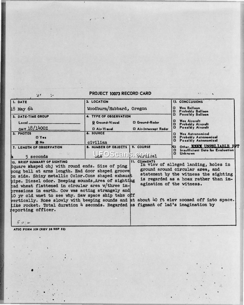 On May 18, 1964, a 10-year-old boy in Woodburn/Hubbard, Oregon, reported observing a square-shaped, shiny metallic object with rounded ends. The witness described the object as being approximately the size of a ping-pong ball at arm's length, featuring a door-shaped groove and a cone-shaped exhaust pipe that emitted a diesel odor. According to the report, the object hovered in a wheat field, made beeping sounds, and then rose vertically before zooming off like a rocket at an altitude of approximately 40 feet. The total duration of the sighting was estimated at five seconds. Following the incident, a circular area of flattened wheat, four feet in diameter, was discovered with three distinct impressions on the edge. The witness's cow was also reported to have been acting strangely. The incident was investigated by the United States Air Force, specifically Major Arthur F. Shiflett, who concluded that the report was non-reliable and likely a hoax or a product of the boy's imagination. The investigator noted that the boy's drawing of the object closely resembled an illustration from a contemporary comic strip. Despite the physical traces found in the field, the official military assessment dismissed the event as a fabrication.