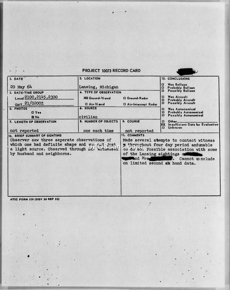 This document is a compilation of reports and investigative findings regarding a series of UFO sightings in Lansing, Michigan, during May 1964. The investigation was conducted by William T. Powers and TSgt David N. Moody of the Dearborn Observatory, in response to reports of strange noises and aerial objects. The investigation identified that many of the reports of 'weird noises' occurring around 3:00 AM on May 21, 1964, were likely caused by a Lansing police car performing an emergency run while using a new 'warbler' siren. Witnesses described the sound as high-pitched and whirring, which the investigator concluded was consistent with the siren's operation. Several visual sightings were also reported. One object, described as a bright blue or blue-green light, was seen by multiple witnesses. The investigation concluded that some of these sightings were likely meteors, while others, particularly those involving blue lights, were potentially attributable to the reflection of police car flashers on a haze layer, or in one instance, the planet Venus. The document includes several 'Project 10073' record cards, police logs, and newspaper clippings from the Lansing State Journal and Detroit Free Press, which detail the public reaction and the confusion surrounding the events. The investigators noted that local police agencies were cooperative and that the reports were often independent. The document concludes that while many reports could be explained by the police emergency run or astronomical phenomena, some events required further investigation.