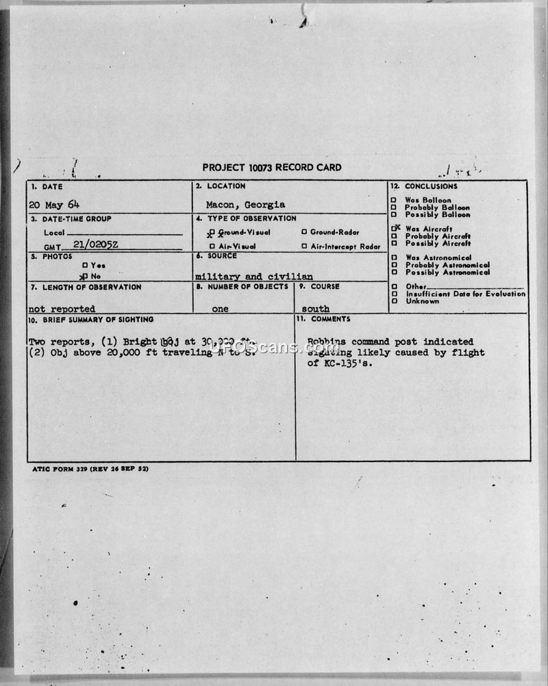 Two reports of a bright object over Macon, Georgia, on May 20, 1964, were investigated by Robins AFB. The sightings were officially attributed to a flight of four KC-135 aircraft.