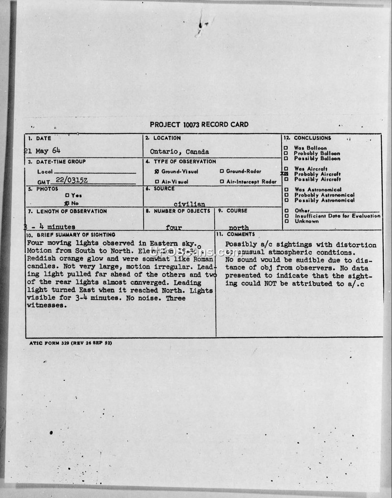 Project 10073 Record Card and Affidavits — Ontario, Canada, 21 May 1964