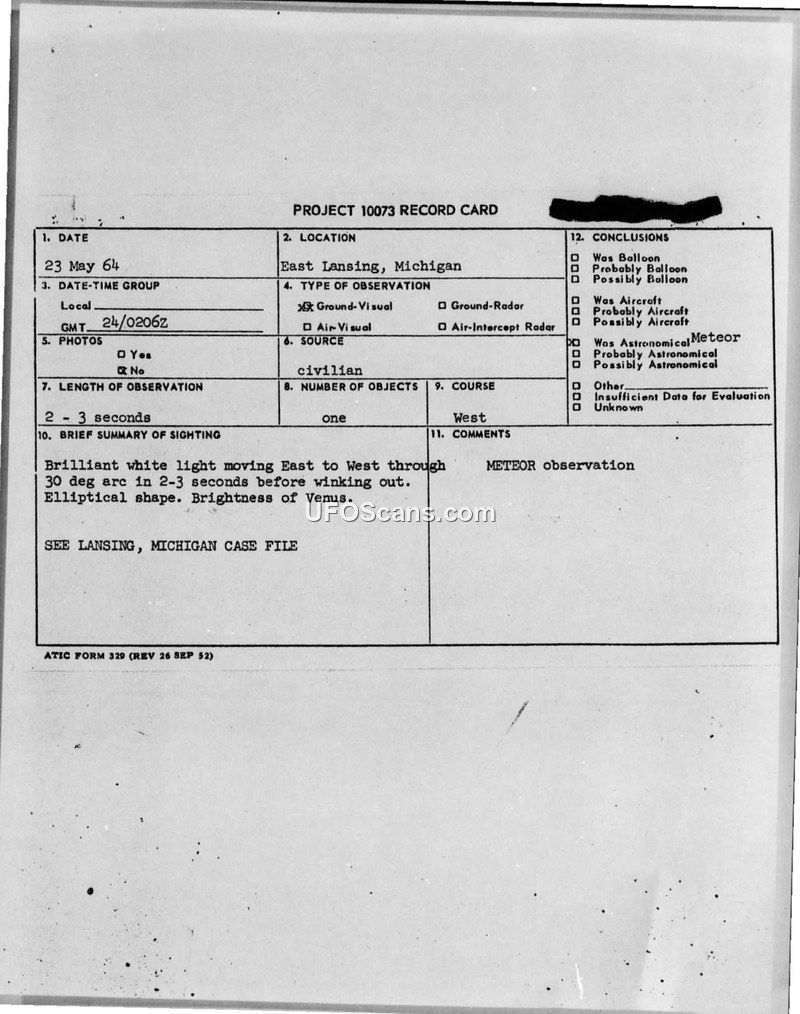 This document contains a series of reports and record cards regarding Unidentified Aerial Phenomena (UAP) sightings in East Lansing, Michigan, occurring between May 23 and May 26, 1964. The primary incidents involve reports from a Michigan State Police Corporal and students from Michigan State University. On May 23, 1964, a Corporal at the Michigan State Police headquarters observed a brilliant white, elliptical object moving from east to west at an elevation of approximately 20 degrees. The object was described as being brighter than Venus and moving for about three seconds before suddenly 'winking out.' A second sighting on May 26, 1964, involved two students on a bicycle who observed a stationary, elliptical, bluish-metallic object that emitted a brilliant white flash before disappearing. While the students initially believed the object returned, they later determined the object they saw was the planet Venus. The investigation, conducted by Cpl. Richard Abbott, concludes that the sightings were likely meteors, though the reports contained inconsistencies regarding movement and behavior that made definitive classification difficult. The reports highlight the difficulty in correlating witness accounts, noting that the anonymous caller reporting an object 'over her house' could not be the same as the object observed by the Corporal and the students. The documents reflect the standard procedure for recording and evaluating such reports under Project 10073, with many cases ultimately being filed as 'insufficient data' due to the brief duration and lack of corroborating evidence.