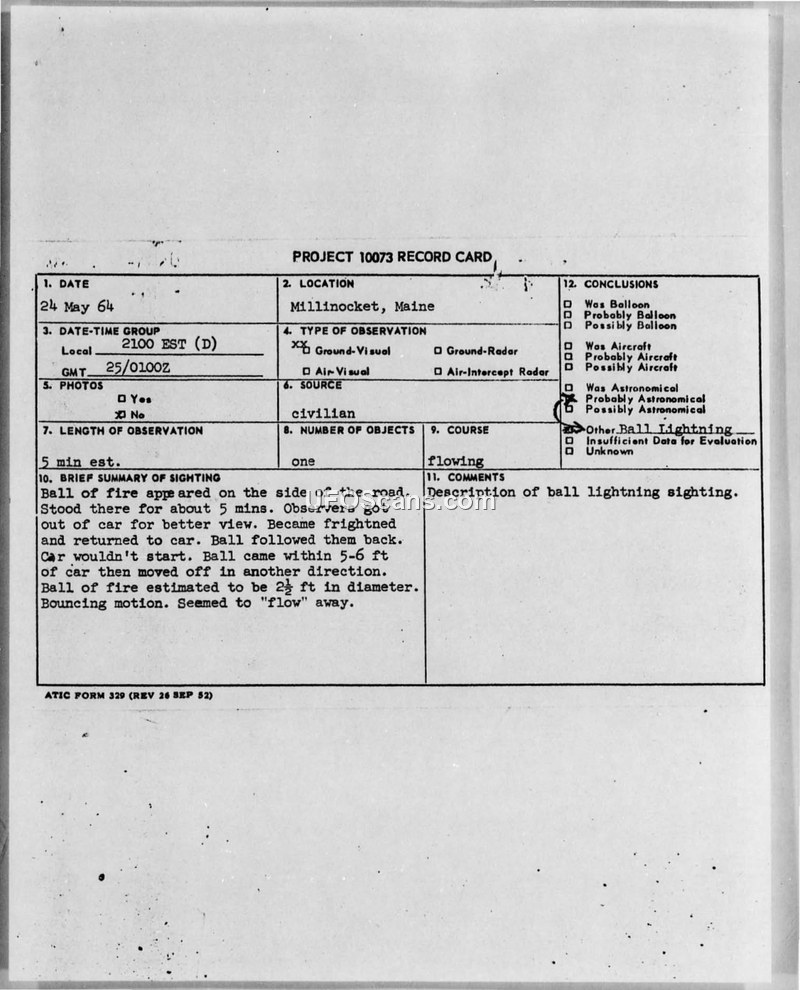 A civilian report of a 2.5-foot 'ball of fire' encountered near Millinocket, Maine, on May 24, 1964, which caused a vehicle to fail to start. The Air Force officially classified the incident as ball lightning.
