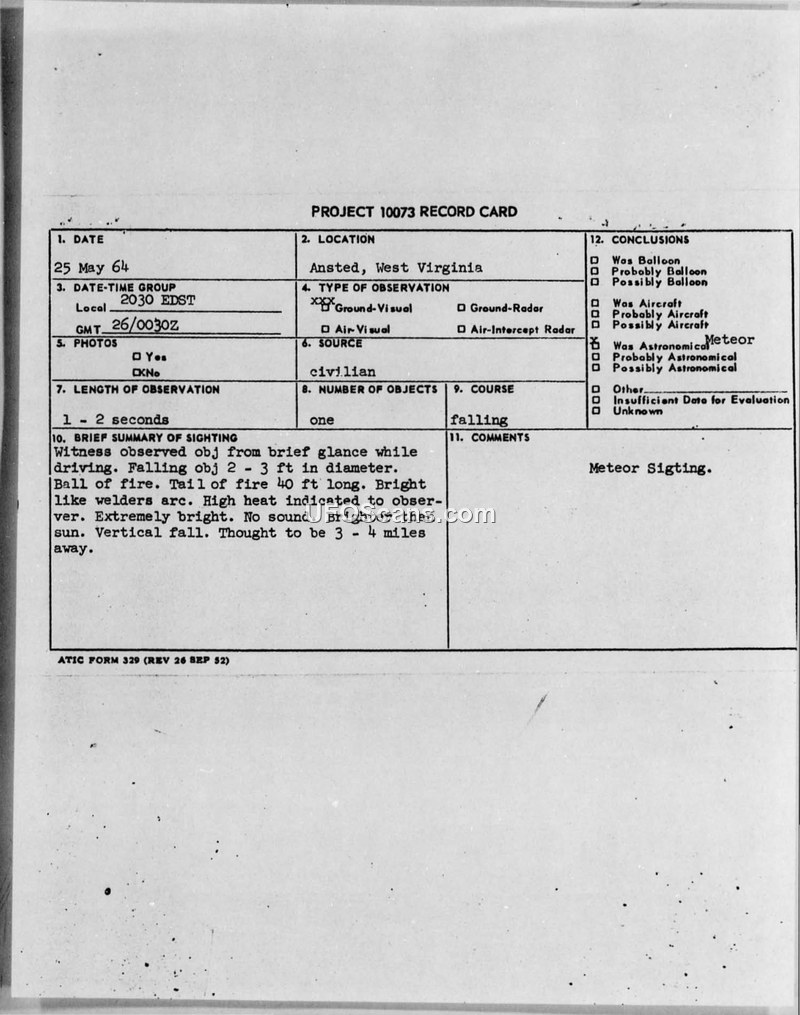 A civilian in Ansted, West Virginia, reported a bright, vertical-falling object on May 25, 1964. The U.S. Air Force Foreign Technology Division evaluated the report and concluded the object was a meteor.