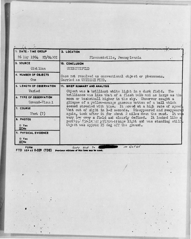 UFO Sighting Report — Pleasantville, Pennsylvania, May 26, 1964