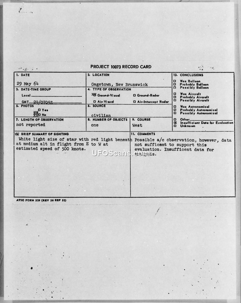 Project 10073 Record Card — Gagetown, New Brunswick, 29 May 64