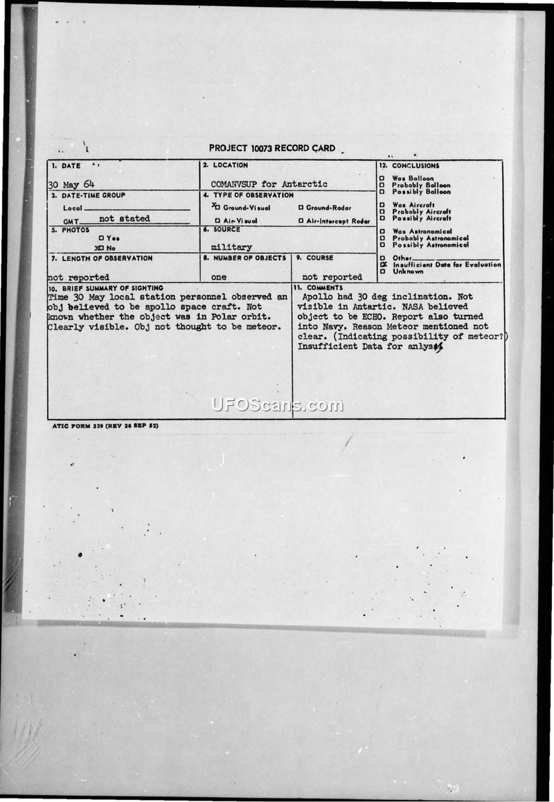 On May 30, 1964, personnel at the COMANVSUP station in Antarctica reported observing an object they believed to be the Apollo space craft. The sighting was reported via a teletype message (TWX) to the Office of Naval Intelligence and Wright-Patterson Air Force Base, specifically for the UFO Sightings Technical Intelligence Center. The observers noted that the object was clearly visible and did not appear to be a meteor, though they were uncertain if the object was in a polar orbit. Subsequent internal notes and a conversation with a Sgt. Moody on June 10, 1964, clarified that the Apollo craft had a 30-degree orbital inclination, which would have made it impossible to be seen from Antarctica. NASA and other evaluators suggested that the object was likely Echo II, as the Navy had received similar reports. The official conclusion recorded on the Project 10073 record card was that there was insufficient data for a definitive evaluation.