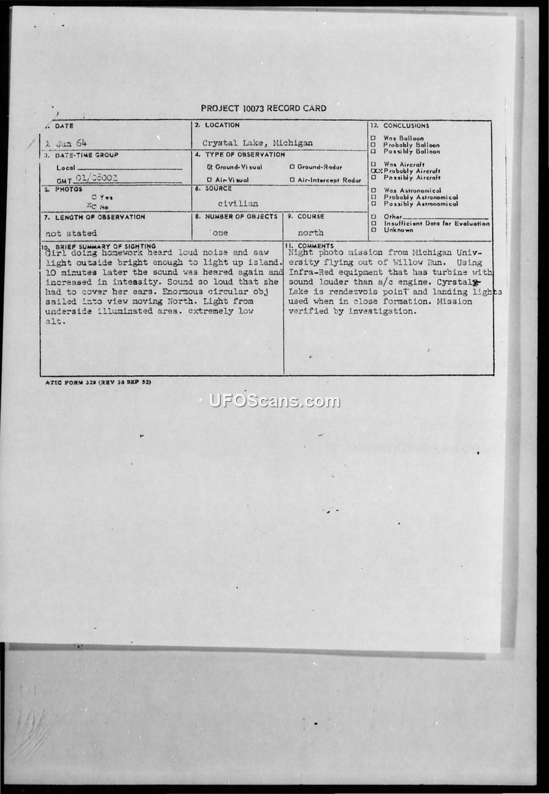 This document comprises a series of field investigation reports conducted by Sgt Moody regarding a cluster of UFO sightings in the Lansing, Michigan area during May and June 1964. The primary incident occurred on 1 June 1964, when a 14-year-old girl at a cottage on Crystal Lake reported a loud, roaring, circular object that illuminated the water and an island. The witness described the object as having a bright underside and projections on the top and bottom. The investigation involved extensive interviews with local tower operators, university researchers, and corporate aviation entities to determine if the sightings could be attributed to classified military or research operations. Sgt Moody discovered that the University of Michigan and other entities were conducting night infra-red photo missions using aircraft equipped with turbines, which generated significant noise and utilized landing lights during maneuvers. The report concludes that the Crystal Lake sighting, along with several other reports in the region, were likely caused by these aircraft. Other reports were dismissed as meteor observations, reflections on fog, or unreliable accounts. The document provides a detailed look at the investigative process used by the Air Force to systematically debunk or identify UAP reports by cross-referencing them with known flight schedules and local environmental conditions.