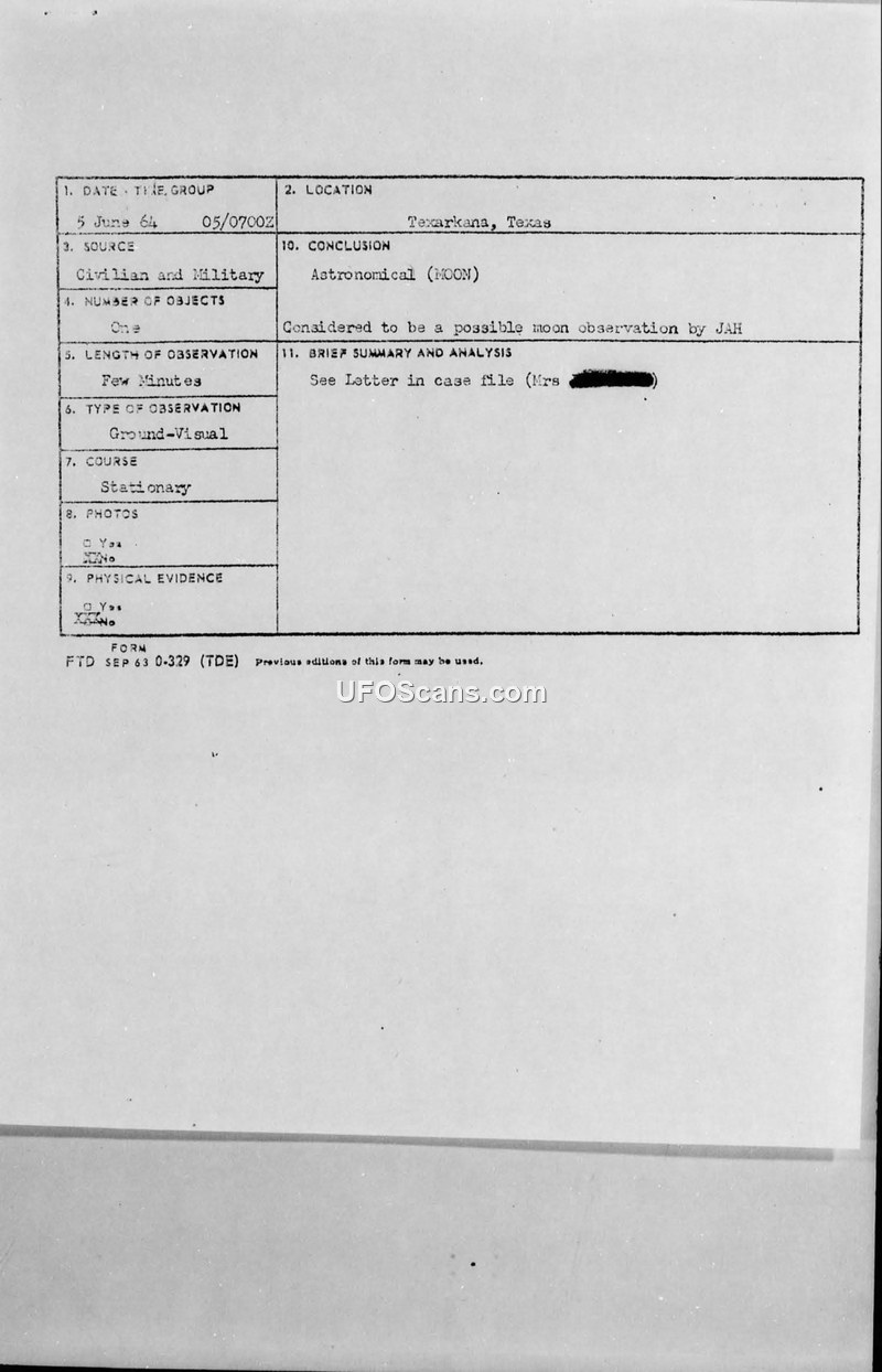 Correspondence regarding UFO sighting near Texarkana, Texas, June 5, 1964