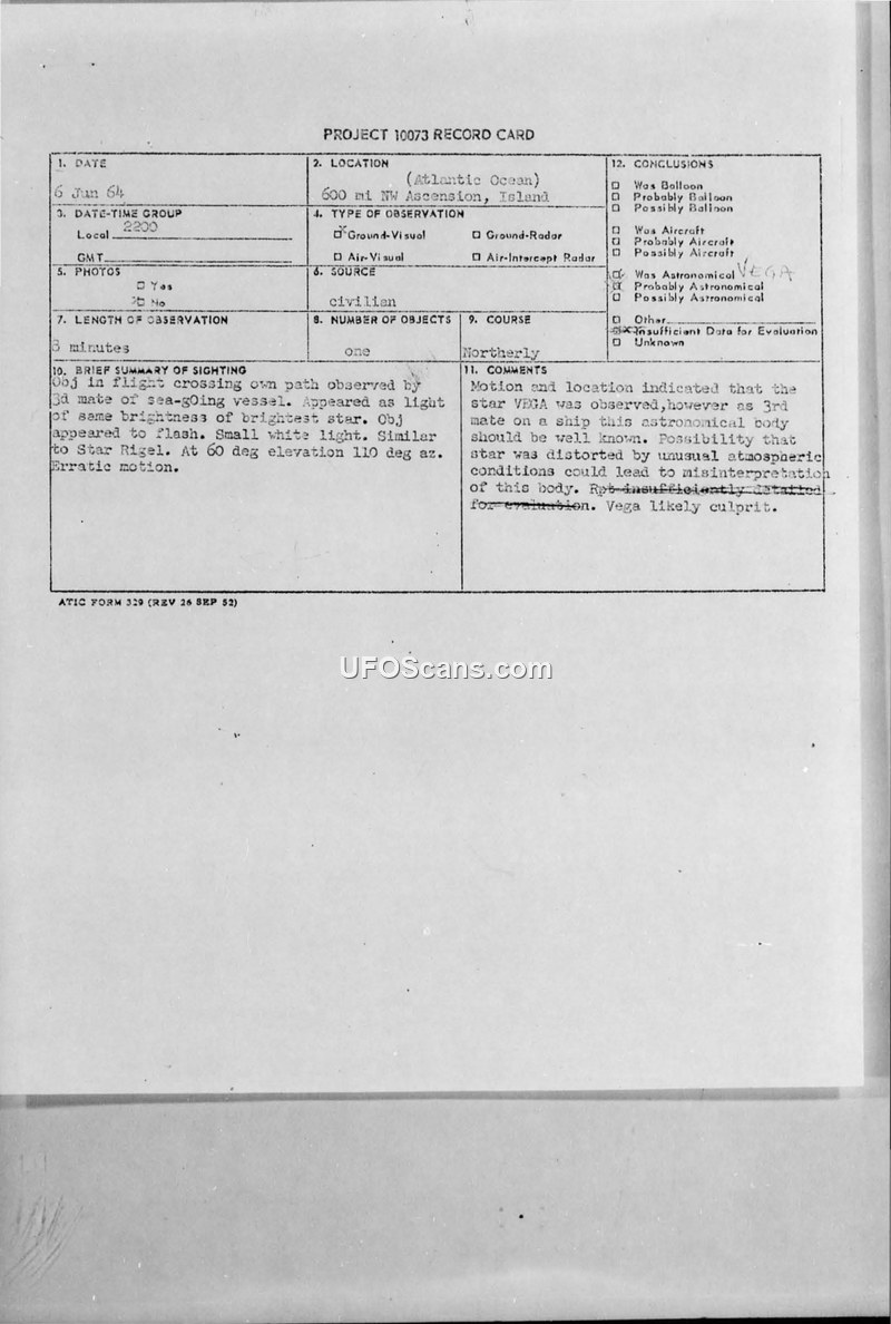 The crew of the SS MORMACPENN reported an unidentified light in the Atlantic Ocean in June 1964. The Foreign Technology Division concluded the object was likely the star Vega, though the report was deemed insufficiently detailed.