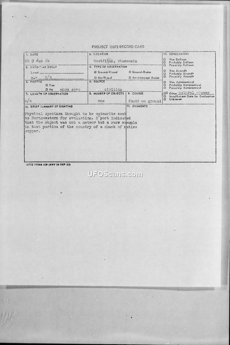 This document file contains a Project 10073 record card and associated correspondence regarding a civilian report of a suspected meteorite found in Westfield, Wisconsin. In June 1964, a resident contacted the Chicago Tribune regarding a metallic object they had discovered, which they believed to be a 'fallen meteor.' The Chicago Tribune directed the resident to the Department of the Air Force at the Pentagon. The resident subsequently sent a description and a small sample of the object to the authorities, describing it as a 'flat-splash shape' weighing approximately 8 pounds. The specimen was forwarded to J. Allen Hynek at Northwestern University for evaluation. In a letter dated August 3, 1964, Dr. Hynek informed the resident that the object was not a meteorite. Instead, he identified it as a rare example of native copper for that region, explaining that such deposits were likely transported to the area by glacial activity. The case was closed with the conclusion that the object was native copper, and the resident was encouraged to keep it as a 'conversation piece.'