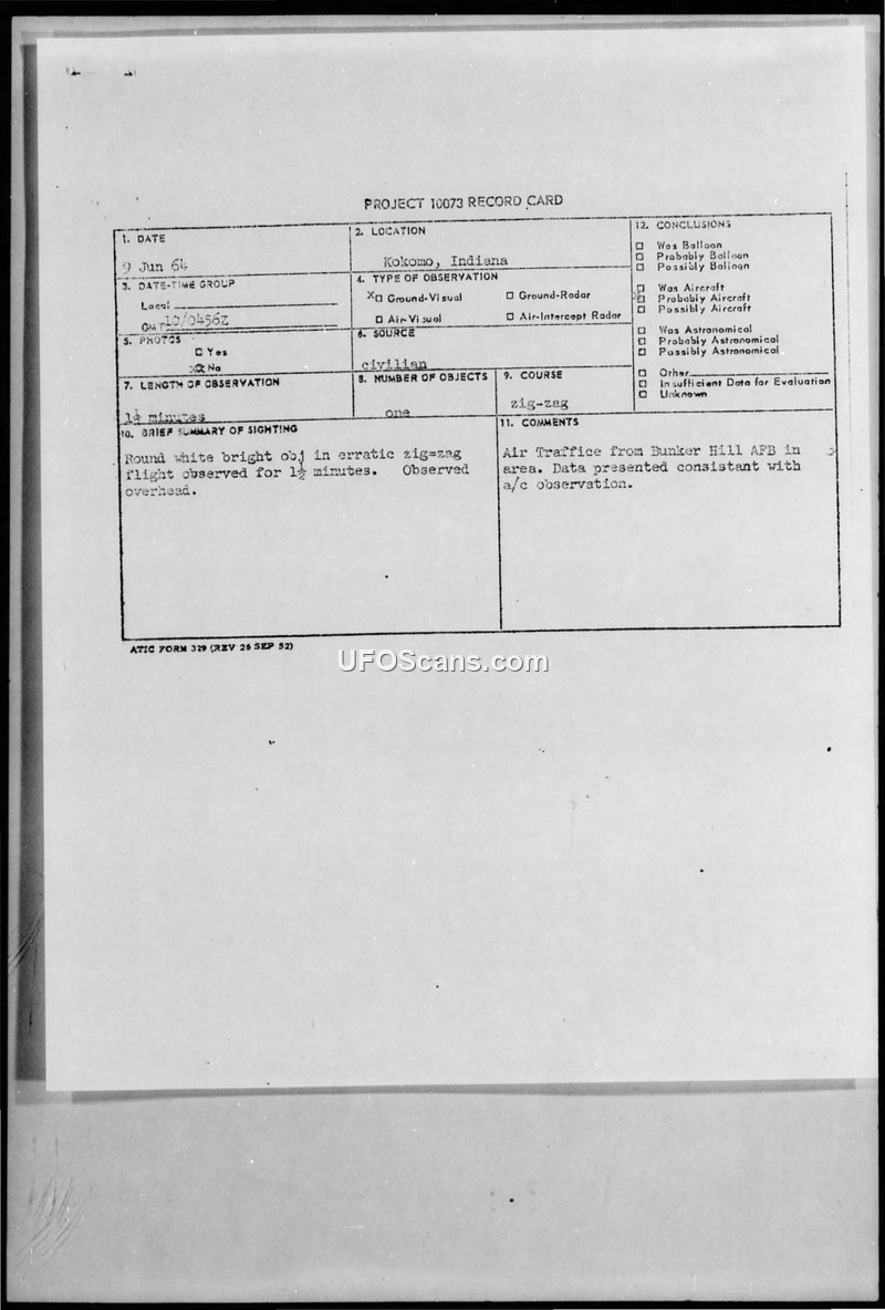 A civilian reported a round, white, erratic object over Kokomo, Indiana, on June 9, 1964. The military investigation attributed the sighting to local air traffic from Bunker Hill AFB.