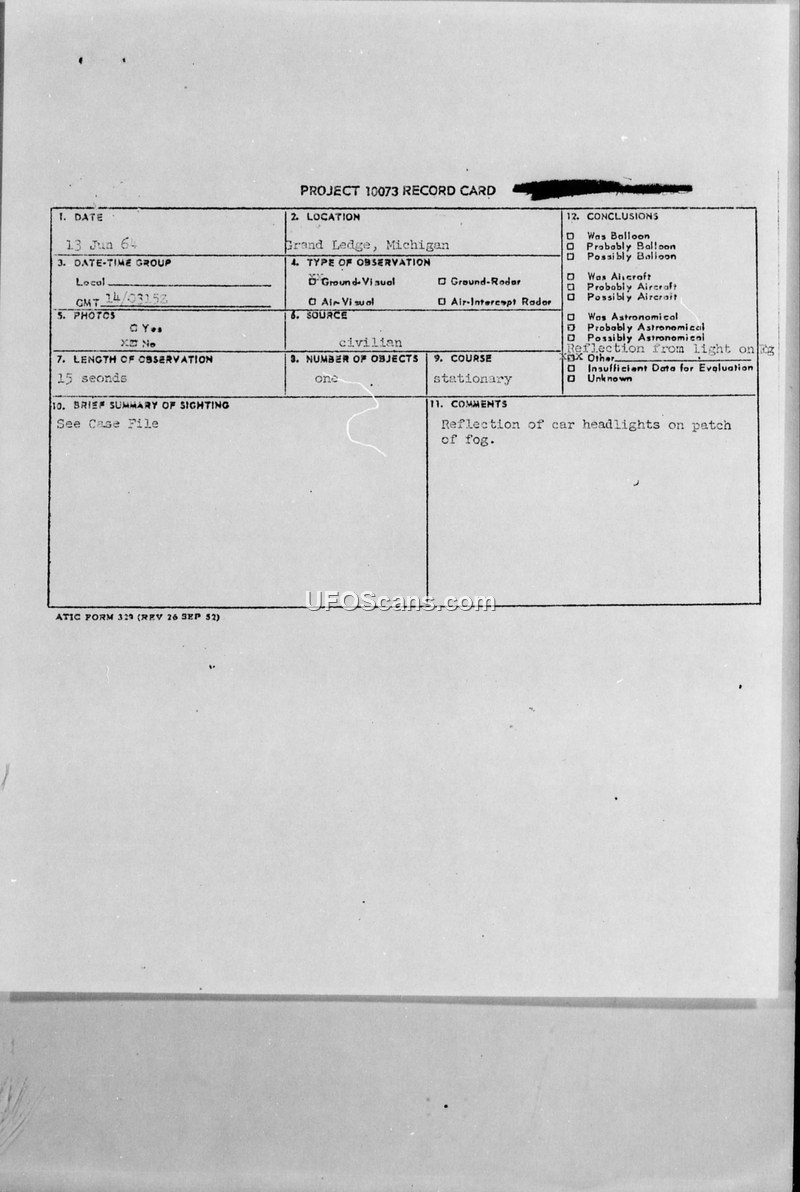 Project 10073 Record Card and Investigation Report — Grand Ledge, Michigan, June 1964