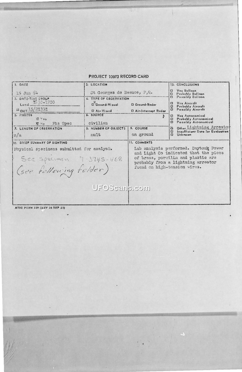 This document archive details the investigation into an incident occurring on 15 June 1964 in St. Georges de Beauce, Quebec, Canada. Witnesses reported an unusual explosion and the presence of unidentified objects. The Royal Canadian Mounted Police (RCMP) recovered physical specimens from the site, which were subsequently transferred to the United States Air Force for analysis. The Foreign Technology Division (FTD) at Wright-Patterson Air Force Base conducted a technical evaluation of these materials. The laboratory analysis, documented in report MAY 64-21, identified the recovered items—consisting of brass, porcelain, and plastic—as components of a lightning arrestor used on high-voltage power lines. The report concludes that the explosion was not associated with an unidentified aerial phenomenon, but rather the failure of this equipment. The archive also includes correspondence from the public regarding other UFO sightings, including reports from Pennsylvania and New Jersey, and internal Air Force communications clarifying that Project Blue Book is an unclassified project and that sightings are investigated based on available data. The documents reflect the Air Force's standard procedure for handling public inquiries and physical evidence related to reported aerial phenomena during the mid-1960s.