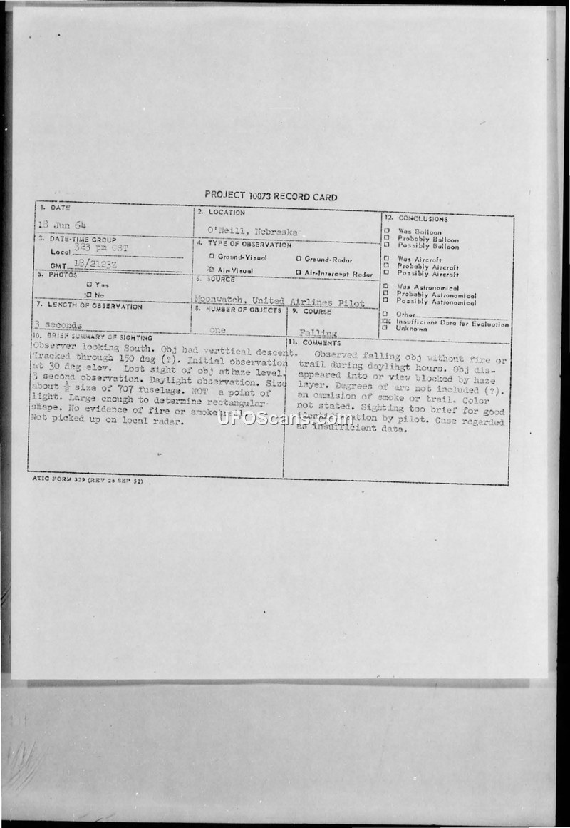 PROJECT 10073 RECORD CARD - O'Neill, Nebraska - 18 Jun 64