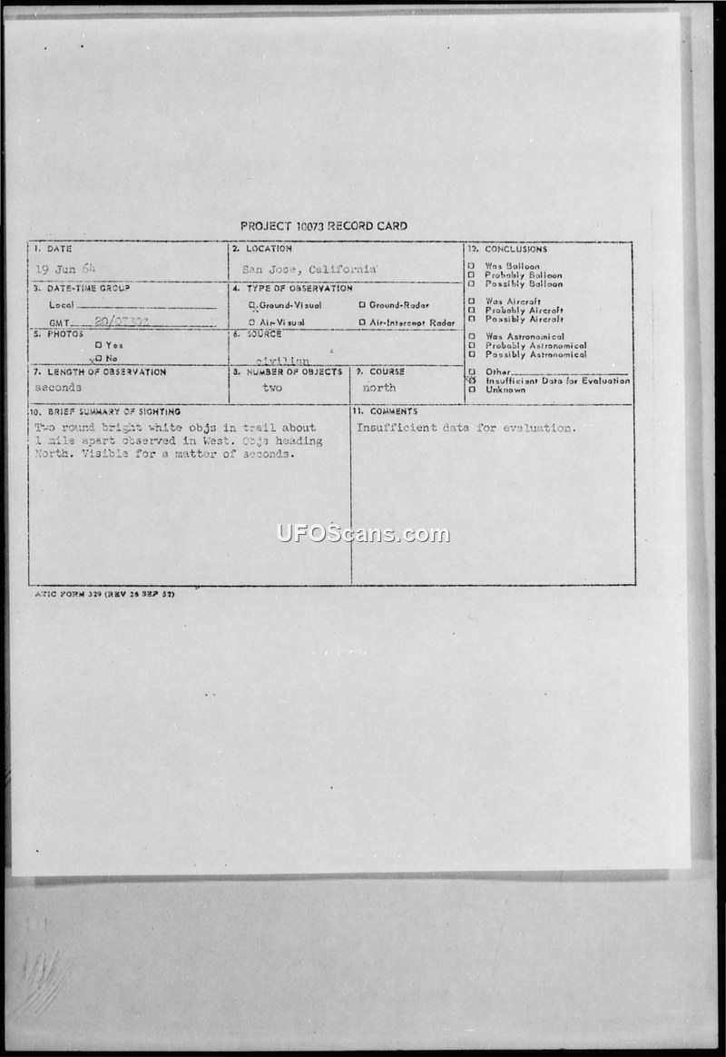 A report of two unidentified bright white objects seen in San Jose, California, on 19 June 1964. The Air Force investigation concluded there was insufficient data to determine the cause.