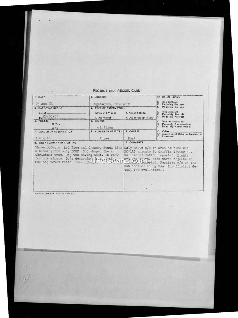 Project 10073 Record Card — Binghamton, New York, 23 June 1964