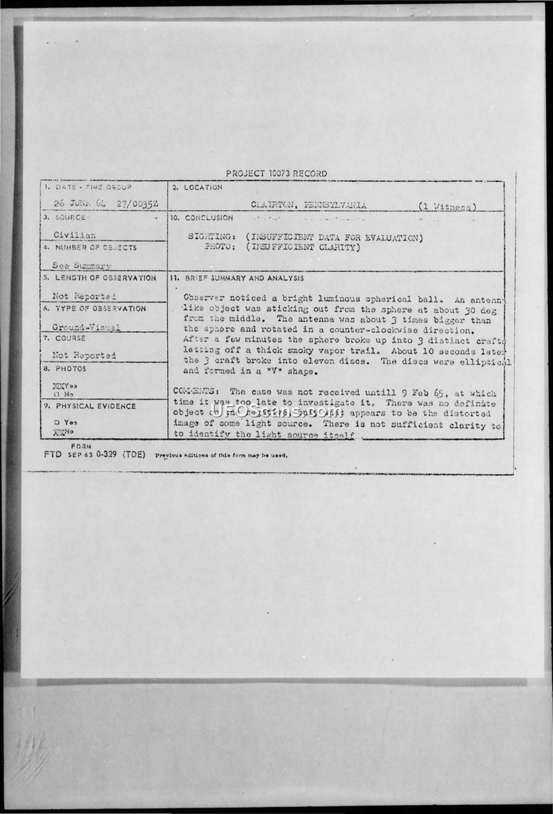 Project 10073 Record — Sighting Report, Clairton, Pennsylvania, 26 June 1964