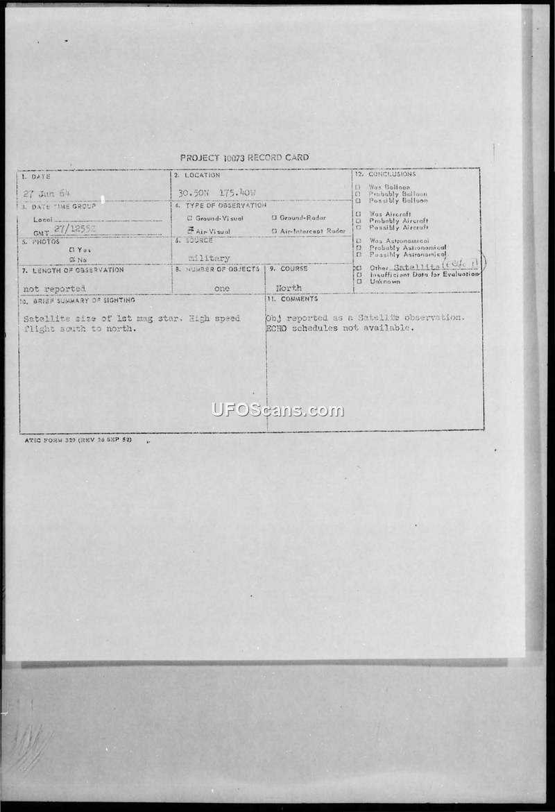 A CIRVIS report from June 27, 1964, documents a high-speed, satellite-sized object observed in the Pacific. The military concluded the object was a satellite.