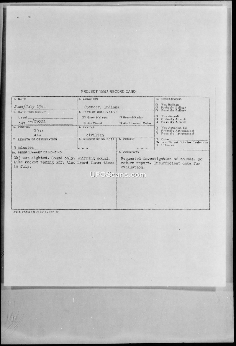 A USAF record card for a June/July 1964 auditory-only sighting in Spencer, Indiana. The investigation concluded there was insufficient data to evaluate the report.