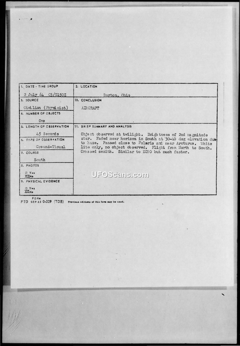 This document is a compilation of Project 10073 records and correspondence from the Foreign Technology Division (FTD) at Wright-Patterson Air Force Base, covering UFO sighting reports in the Dayton, Ohio area during July 1964. The records consist of standardized U.S. Air Force technical information questionnaires completed by civilian witnesses, internal FTD memos, and duty officer reports. The primary focus of these documents is the investigation of various aerial phenomena reported by citizens. Many of the reports describe bright, star-like objects moving across the sky. The FTD investigators consistently evaluated these sightings against known satellite orbital data, particularly for the ECHO I and ECHO II satellites. Several reports were concluded to be observations of these satellites, while others were identified as meteors. The documentation highlights the process of receiving reports from the public, often via telephone, and the subsequent efforts by military personnel to correlate these sightings with known space objects or astronomical events. In several instances, the investigators noted that the reported movement or timing of the objects was likely due to observer error or misidentification of satellite passes. The records also include sketches and descriptions provided by witnesses, detailing the appearance, color, and motion of the objects, which were frequently described as bright, white, or star-like. The administrative nature of the documents, including signatures from officers like Major John C. McNeill, underscores the systematic approach the Air Force took in cataloging and explaining these phenomena during this period.