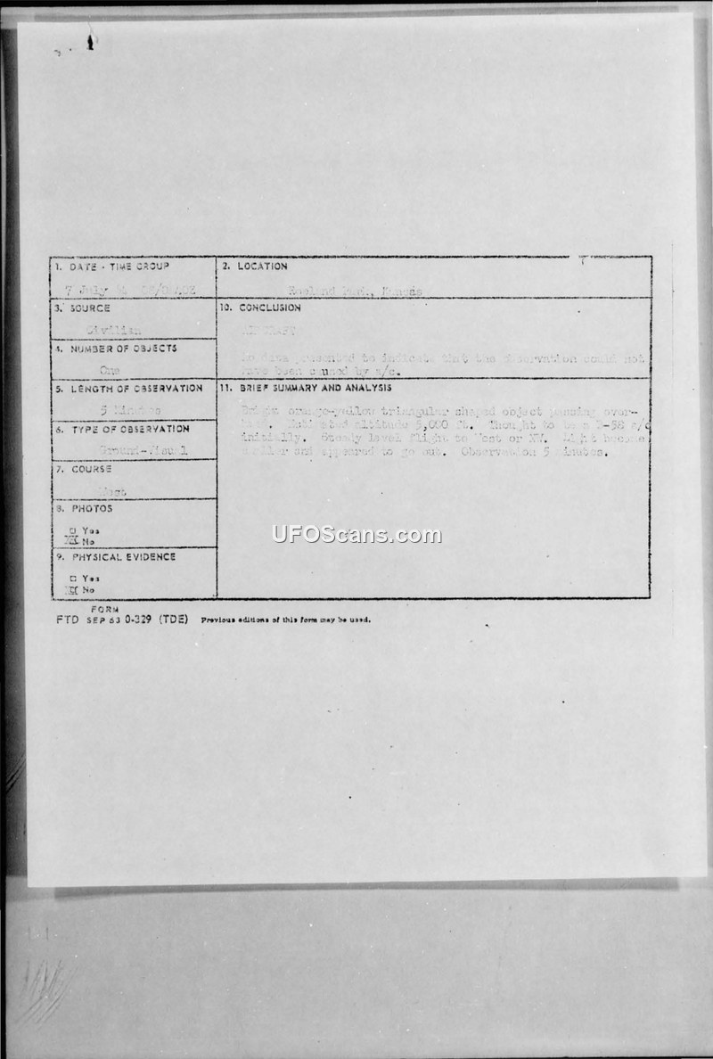 A report of a triangular, orange-yellow object seen over Roeland Park, Kansas, on July 3, 1964. The official conclusion suggests the sighting could have been an aircraft.