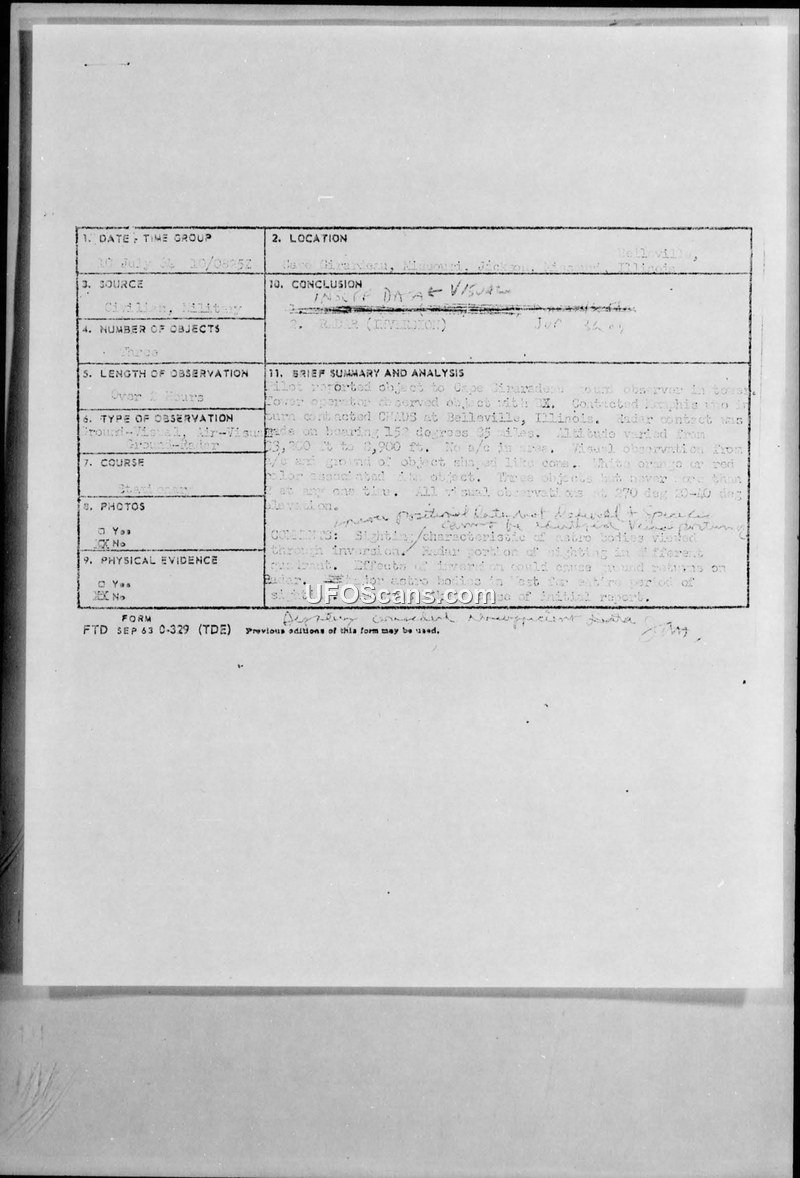 A pilot and an FAA operator reported three unidentified objects over Missouri on 10 July 1964, which were also tracked by radar. The Air Force investigated the incident but reached no identification, later requesting weather data to check for atmospheric inversions.