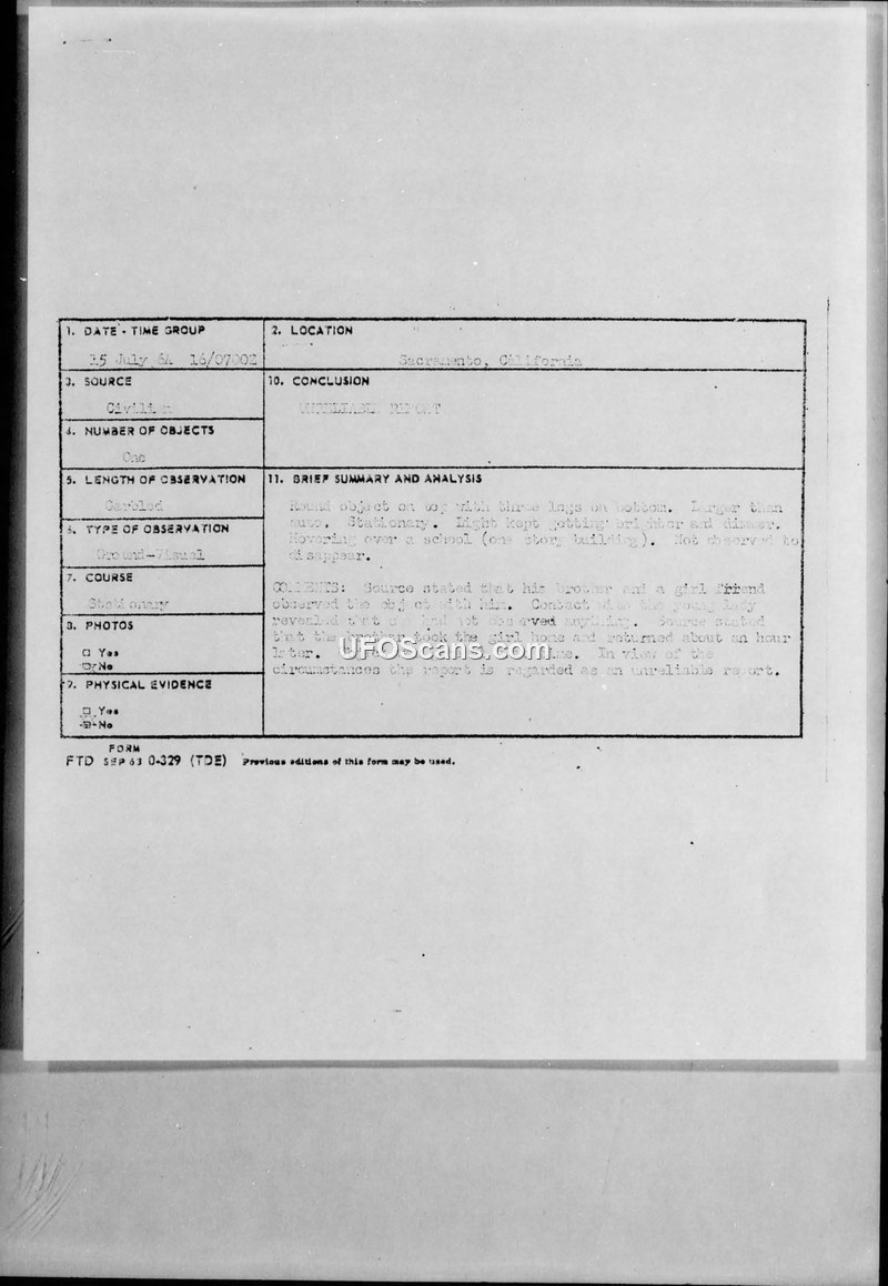 An Air Force report detailing a 1964 UFO sighting in Sacramento, California, involving a round object with three legs. The report was officially classified as unreliable due to a lack of corroborating evidence.