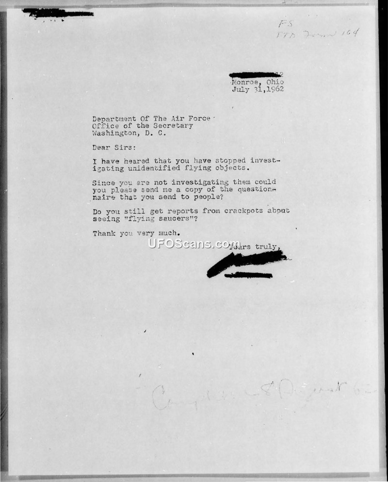 Correspondence Regarding UFO Sightings in Cleveland, Ohio (1962-1964)