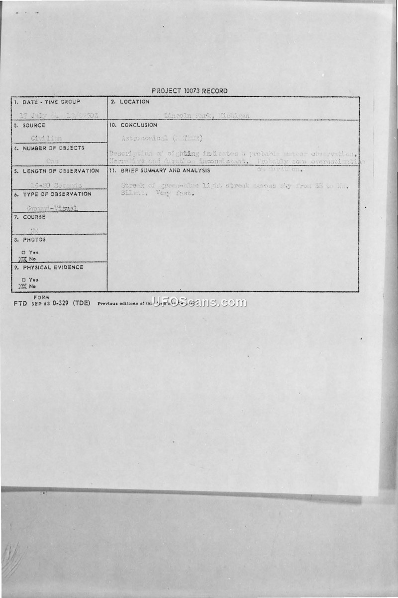 On July 17, 1964, at approximately 9:50 PM, a civilian witness in Lincoln Park, Michigan, observed a green-blue light streak moving across the sky. The witness reported that the object traveled from the southeast to the northwest, was silent, and moved very fast. The witness estimated the altitude of the object to be between 30 and 50 feet, noting it was lower than trees on Southfield Road. The observation lasted between 15 and 20 seconds. The official conclusion recorded under Project 10073 classified the event as an astronomical phenomenon, specifically a probable meteor, noting that the witness's narrative and duration estimates were inconsistent and likely overestimated.