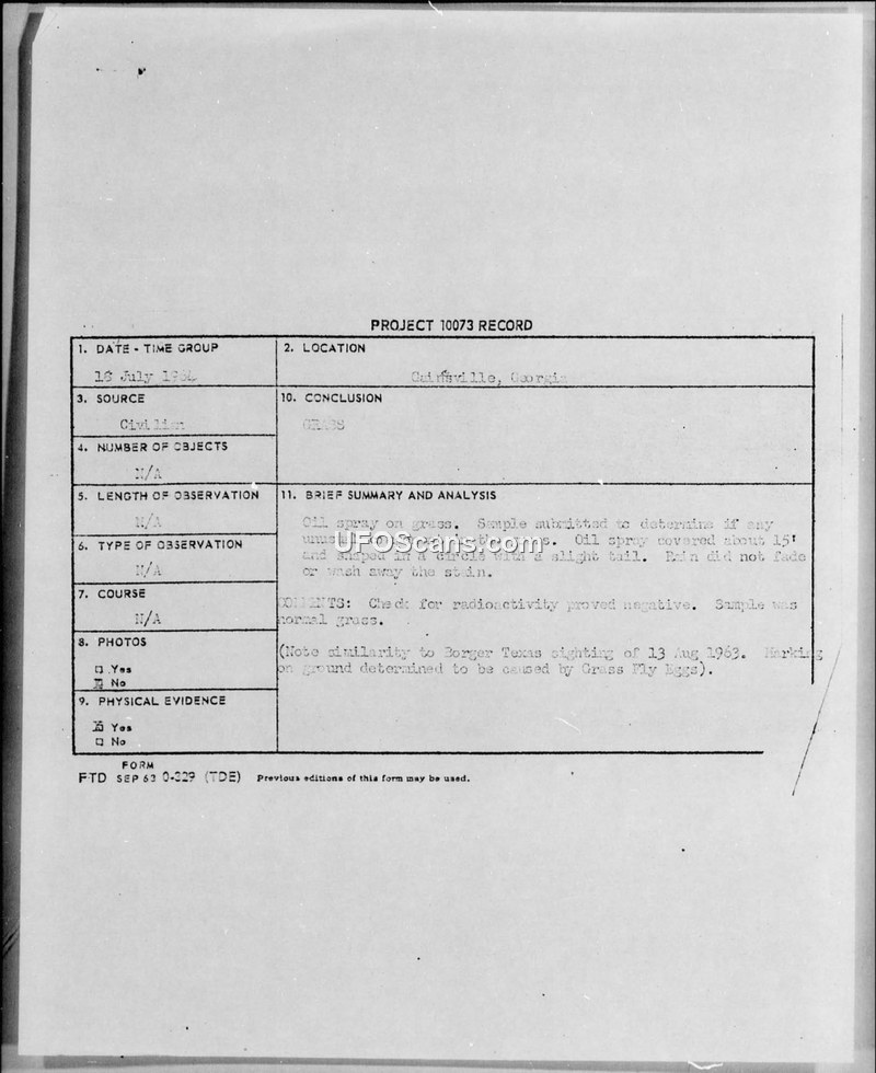 The grass samples were normal. The sighting was not officially reported to the Air Force. A separate sighting in Spartanburg, South Carolina, was attributed to ball lightning.