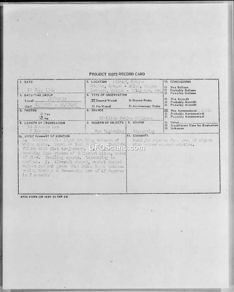 A July 19, 1964, sighting of a bright object over the Pacific Northwest was initially reported as a UFO but was later scientifically identified as a bolide (meteor) by the American Meteor Society and the U.S. Air Force.