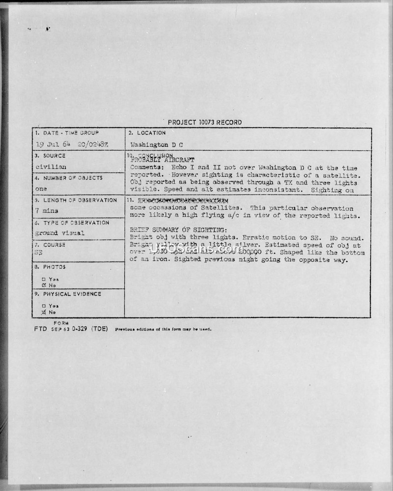 Project 10073 Record — Sighting Report, Washington D.C., 19 July 1964