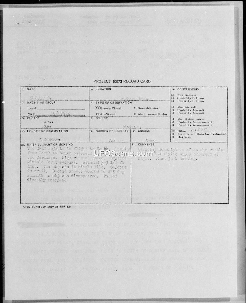 Two maintenance workers reported seeing two V-shaped objects flying over a Thiokol Chemical Corp plant in Utah on July 20, 1964. The Air Force investigation concluded the objects were birds.