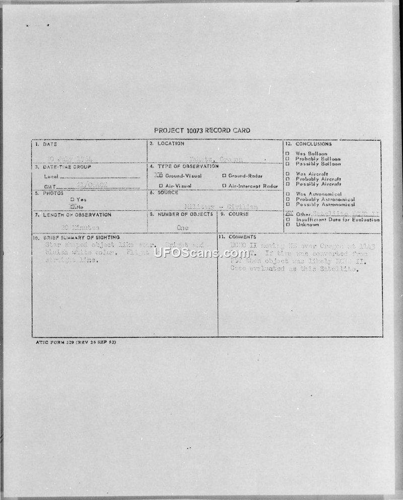 Project 10073 Record Card and Incoming Message — Sighting near Yahatz, Oregon, 21 July 1964