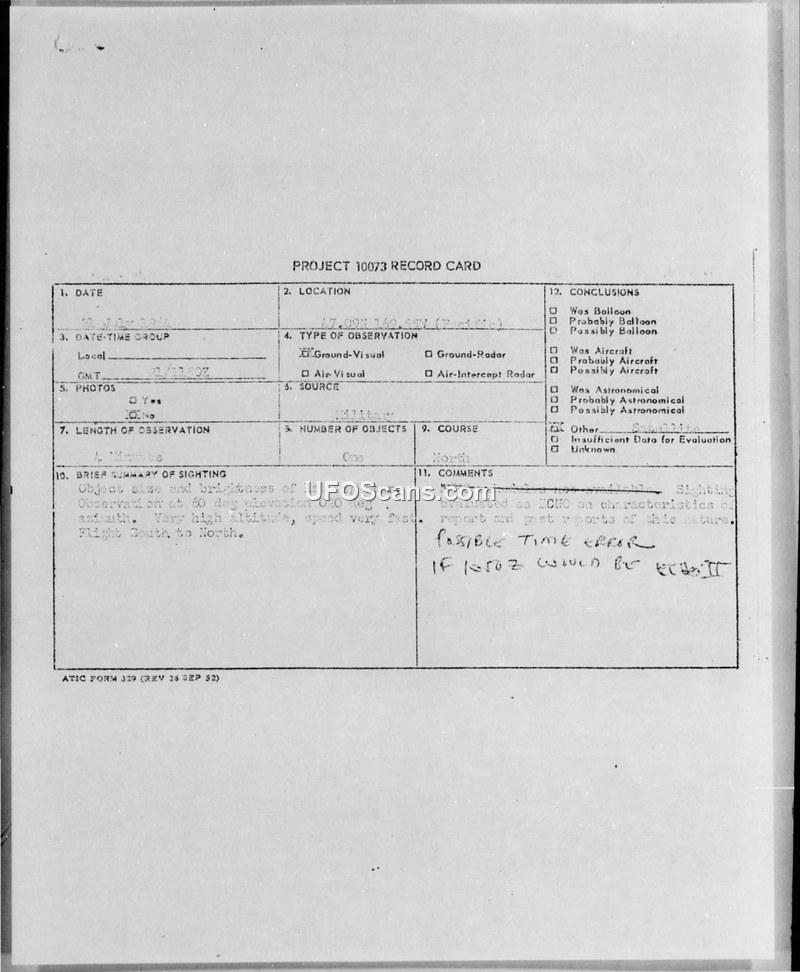 The sighting was evaluated as a UFO with the characteristics of a 1st magnitude star. The report notes a possible time error in the original transmission.
