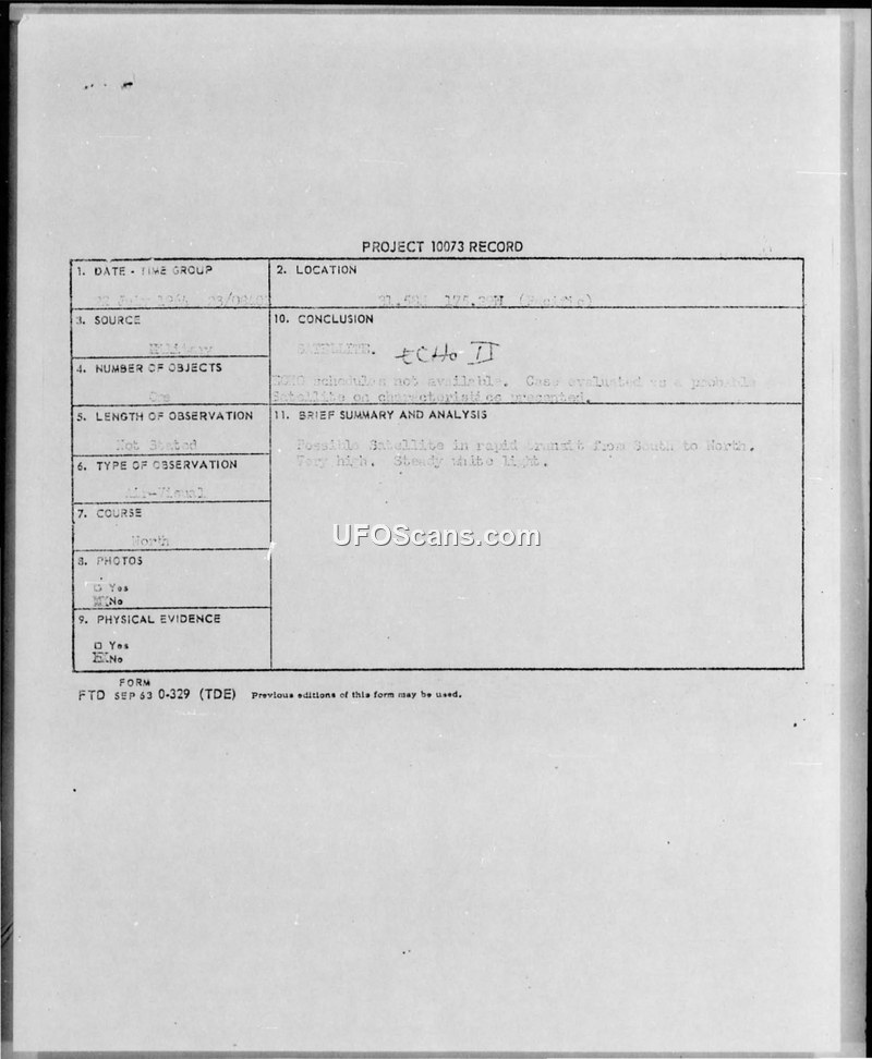 A 1964 CIRVIS report of a high-altitude, steady white light in the Pacific was evaluated by the Air Force as a probable Echo II satellite. The report was distributed to multiple military and intelligence commands.