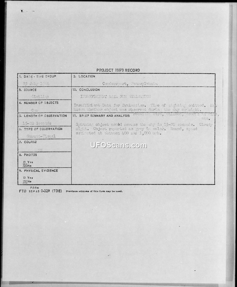 PROJECT 10073 RECORD — Coudersport, Pennsylvania, 23 July 1964