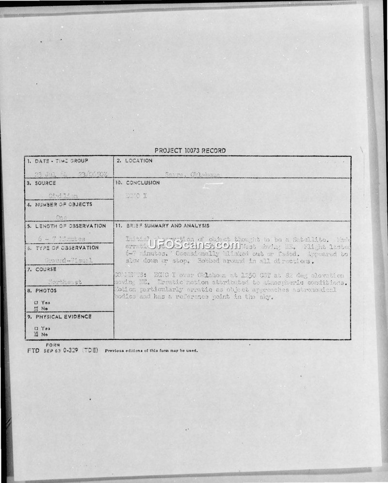 Project 10073 Record — Sighting Report, Sayre, Oklahoma, July 23, 1964