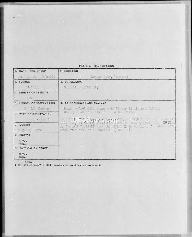A series of civilian UFO reports in Kansas City during July and August 1964 were investigated by the 328th Fighter Wing. The Air Force concluded the sightings were likely satellites (ECHO I/II) or astronomical bodies like Arcturus.