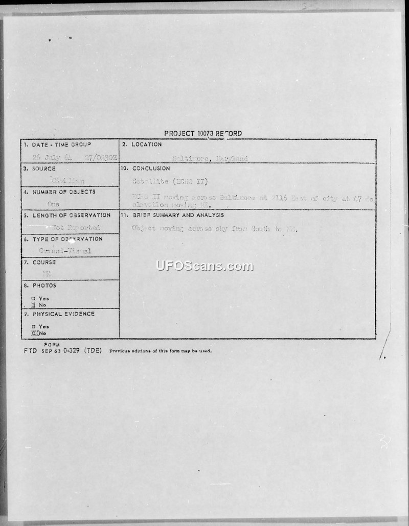 Project 10073 Record — Sighting of Echo II, Baltimore, Maryland, July 26, 1964