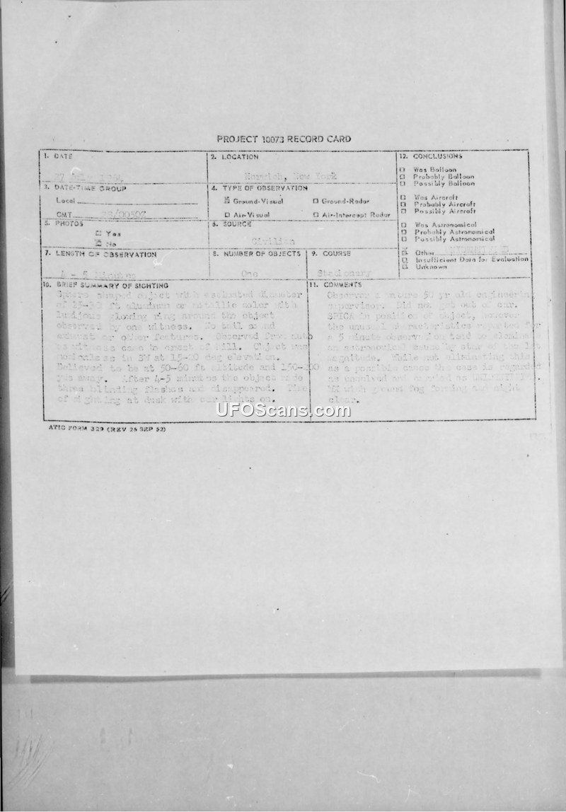 Project 10073 Record Card — Norwich, New York, 27 July 1954