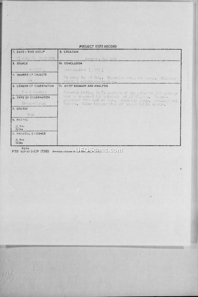 A witness reported a bright, multi-colored aerial flash over Roxbury, New York, on July 27, 1964. The event was officially classified by Project 10073 as a meteor, despite noted inconsistencies in the object's flight path.